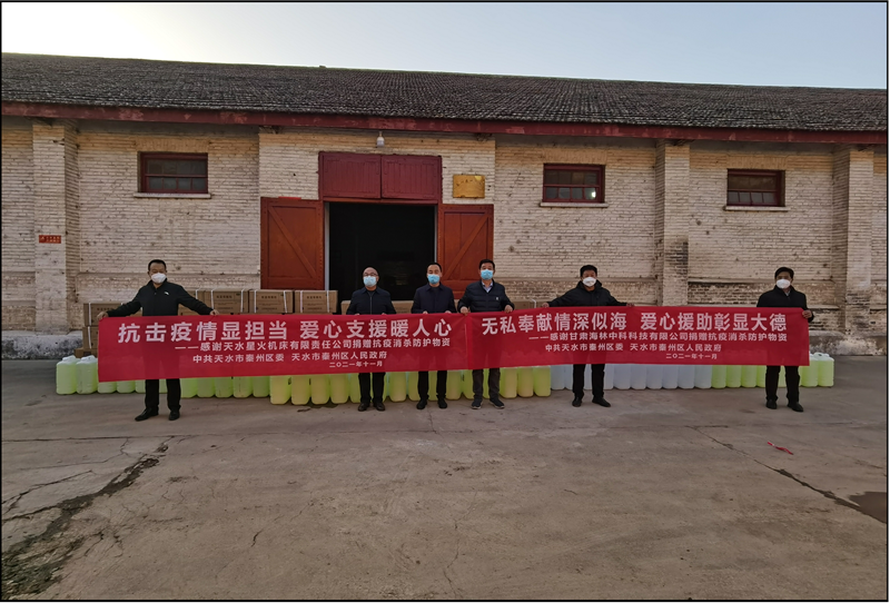 11月8日:甘肅海林中科科技股份有限公司、天水星火機床有限公司各捐贈價值5萬元的醫(yī)用防護服、隔離臉罩、隔離鞋套、N95口罩、消毒液等防疫物資。