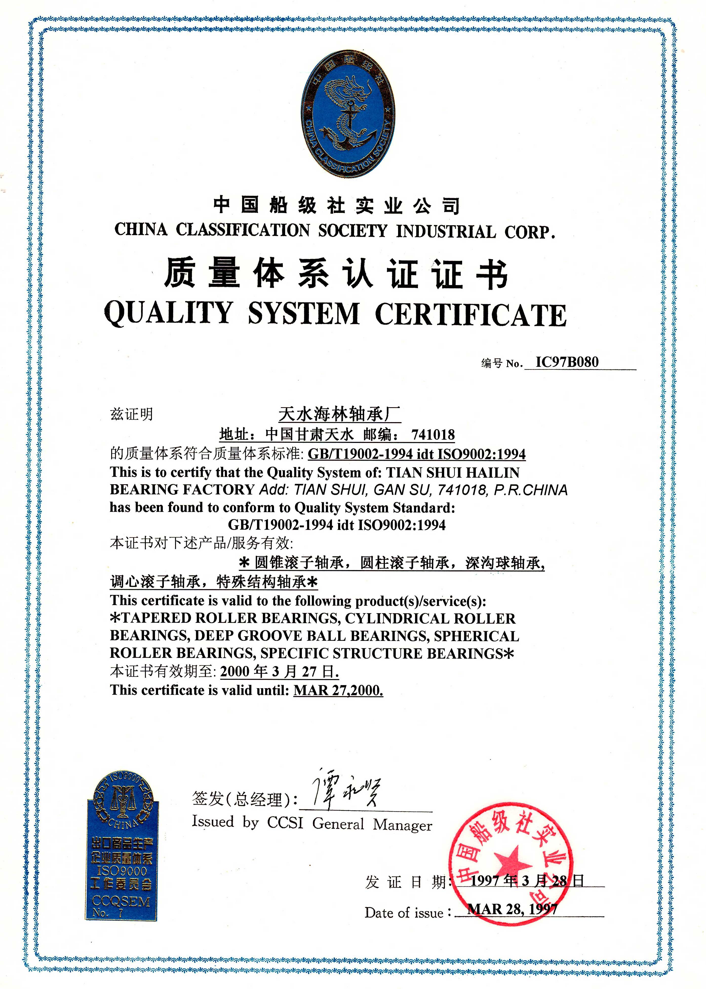 1997年通過(guò)中國(guó)船級(jí)社質(zhì)量認(rèn)證中心ISO9002:1994標(biāo)準(zhǔn)認(rèn)證